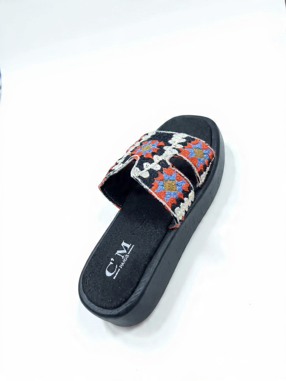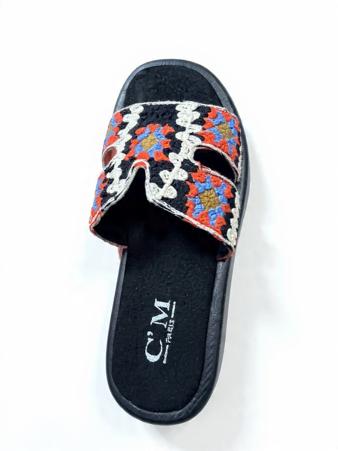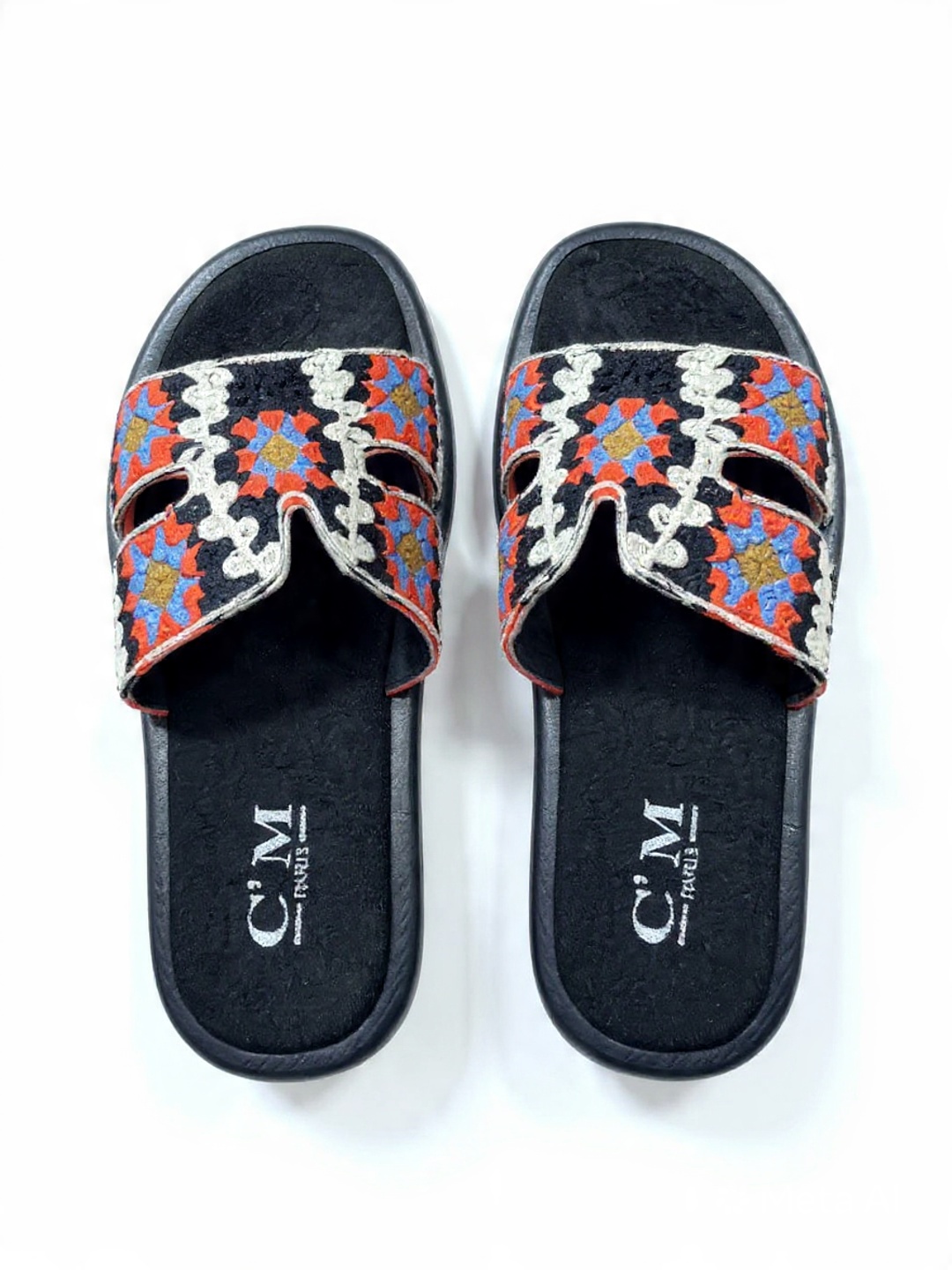 Fall under the spell of this embroidered C'M Paris mule, a perfect blend of comfort and style. Its unique design is sure to turn heads, thanks to its wide strap adorned with woven ethnic motifs: a vibrant mix of coral red, royal blue, ochre, and white on a black background. The H-shaped cutouts on the strap add a modern touch and allow the foot to breathe. The flexible, cushioned black sole ensures optimal comfort for all-day walking without fatigue. The clean finish and C'M Paris quality guarantee long-lasting durability. Product Details: Model: Women's mule sandal, without a back strap Strap Material: Embroidered fabric in a kilim/Berber rug style Sole: Black, flat, and comfortable, sporty-chic style Brand: C'M Paris Style: Bohemian, ethnic, summery, casual chic Ideal with: A flowing maxi dress, mom jeans, linen shorts, or beachwear. Perfect for holidays, outings in the city or simply for looking stylish at home. |